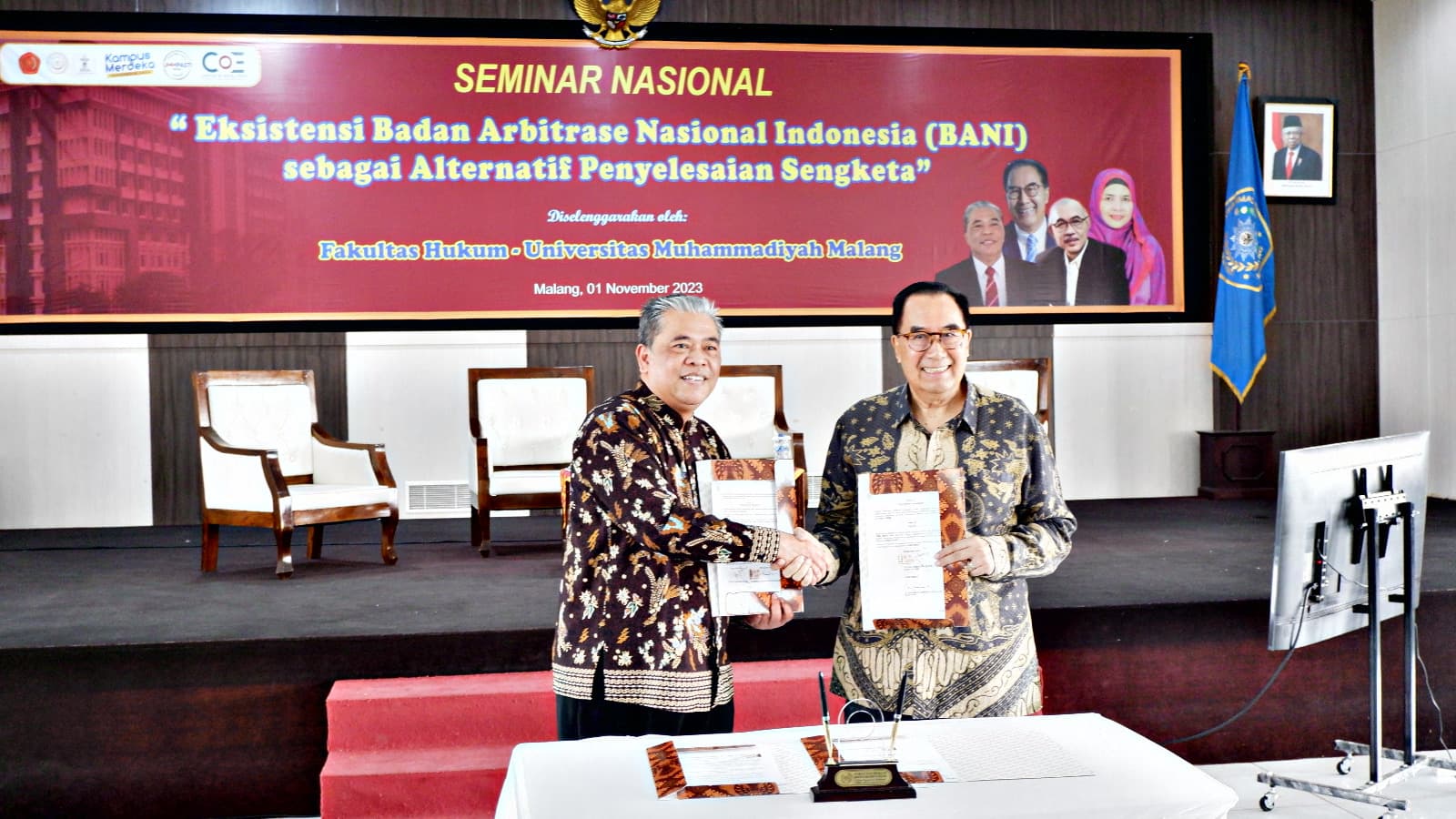 Setelah ucapan-ucapan pembuka oleh Prof. Dr. Tongat, S.H., M.hum terdapat kegiatan penandatanganan kerjasama antara FH UMM dan juga BANI yang dilaksanakan oleh Prof. Dr. Tongat, S.H., M.hum selaku Dekan FH UMM dan Dr. Anangga W. Roosdiono, S.H., L.LM., FCBARB selaku ketua BANI.