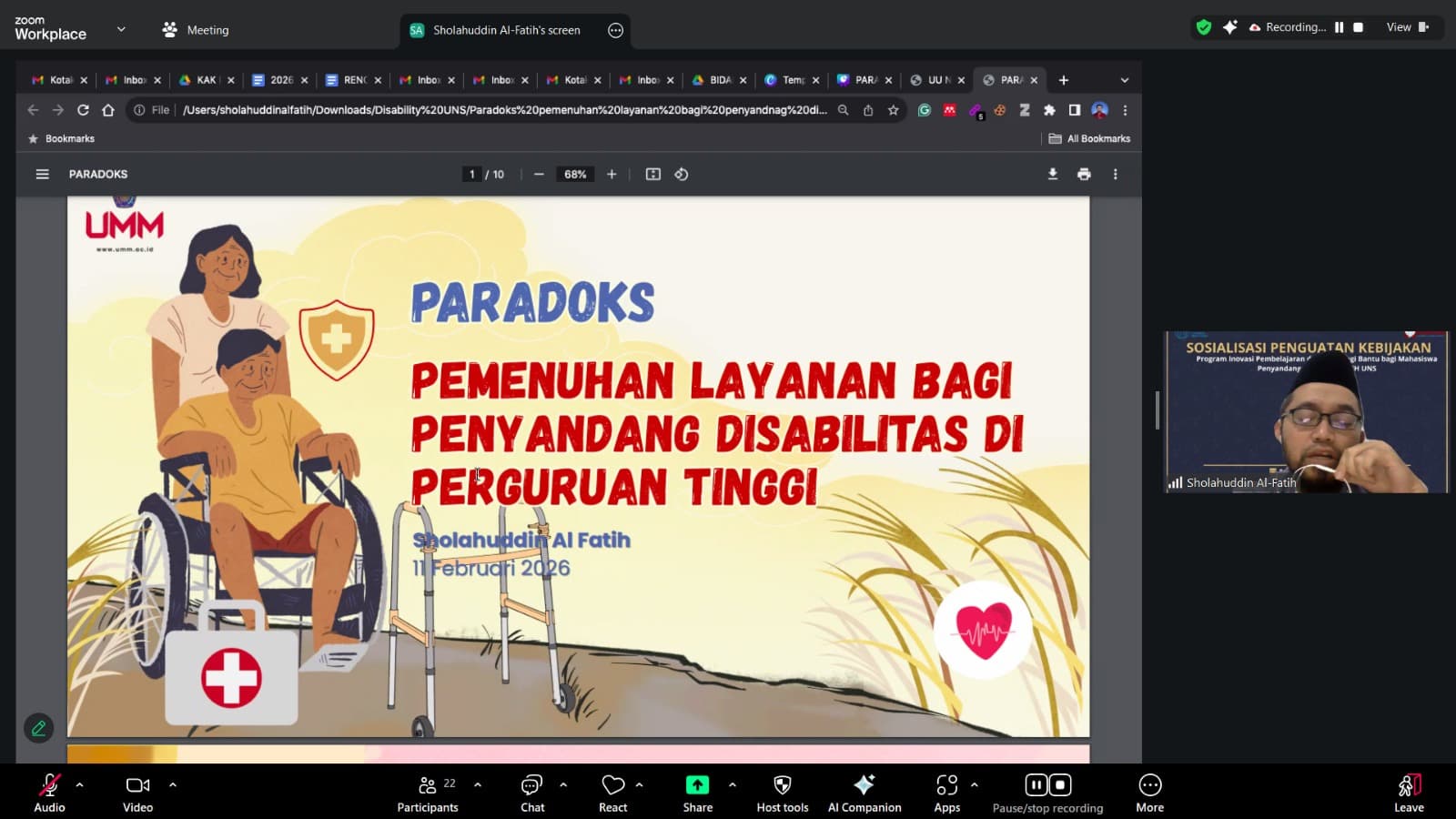 Workshop menghadirkan Dr. Sholahuddin Al-Fatih, S.H., M.H., Wakil Dekan I Fakultas Hukum Universitas Muhammadiyah Malang (FH UMM), sebagai narasumber bersama dengan Dr Astri Hanjarwati, MA, Wakil Dekan sekaligus Tim Ahli Pusat Layanan Disabilitas UIN Sunan Kalijaga Yogyakarta. Dalam pemaparannya, Fatih menekankan bahwa pemenuhan hak penyandang disabilitas di perguruan tinggi bukan sekadar kewajiban administratif, melainkan bagian dari tanggung jawab konstitusional dan moral institusi pendidikan.
