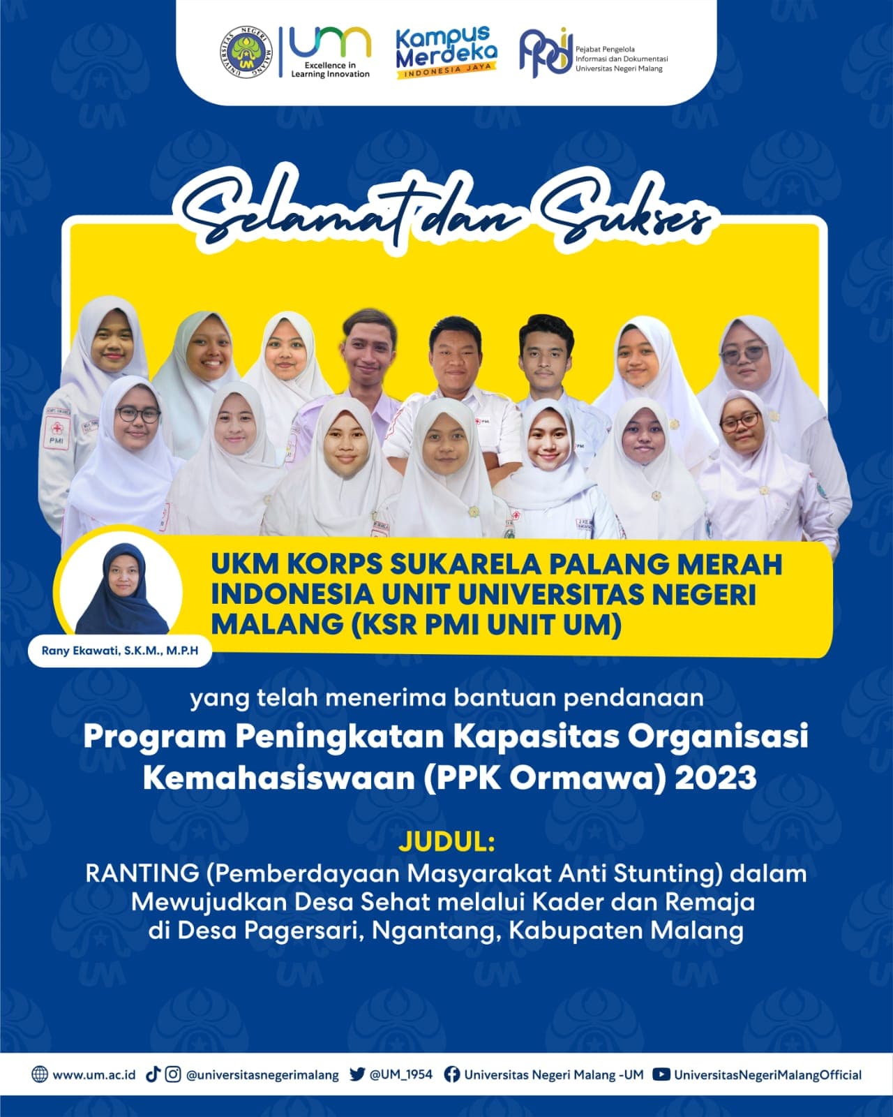 Unit Kegiatan Mahasiswa KSR PMI Unit Universitas Negeri Malang sukses tahap pendanaan Program Penguatan Kapasitas Organisasi Kemahasiswaan (PPK ORMAWA) yang diselenggarakan oleh Direktorat Pendidikan Tinggi 2023. Pengumuman pendanaan diumumkan pada 14 Juni 2023 lalu. Ide yang diusungkan oleh KSR PMI UNIT UM pada tahun 2023 adalah mengangkat Desa Sehat dengan masalah mengenai stunting. Program ini dipaparkan pada saat presentasi sub proposal oleh ketua tim Eva Uma Widyastuti mahasiswi prodi Ilmu Kesehatan Masyarakat, Hafif Ahmad Abdul Aziz mahasiswa prodi Teknik Sipil, Syalwa Dida Wuriyanti mahasiswi prodi biologi. UKM KSR PMI merupakan organisasi kemahasiswaan ditingkat universitas yang bergerak dalam bidang relawan dan kemanusiaan. UKM KSR PMI sejalan dengan kompetensi yang dimiliki dengan topik yang diangkat. Dukungan dari berbagai pihak seperti support anggota tim, support ORMAWA, pengurus, dosen pembina, dosen pembibing, serta pihak universitas dan mitra desa yang menghantarkan tim lolos pendanaan.