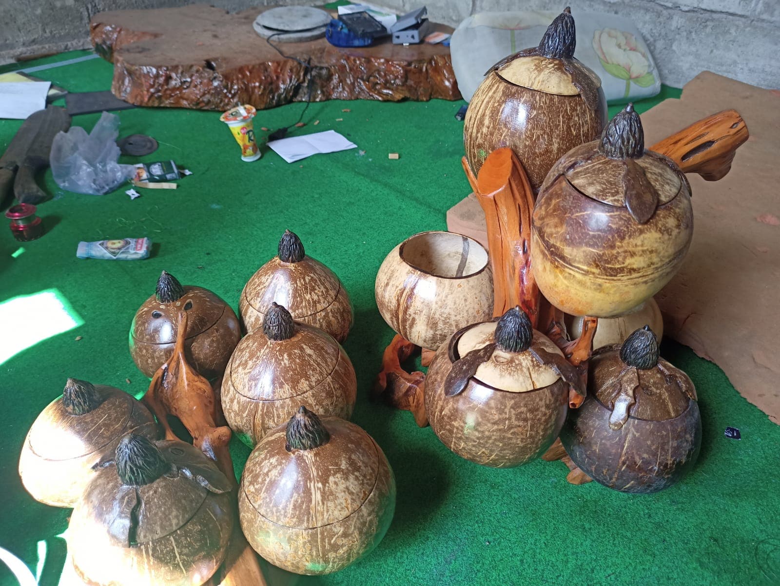 Pak Bagong mampu membuat kerajinan batok kelapa dalam berbagai bentuk antara lain pajangan rumah, toples camilan, gantungan kunci, pot bunga, peralatan makan, dan berbagai furniture lainnya. “Kalau ada contoh desainnya, seperti foto, gitu, tambah gampang dan cepet,” jelasnya. Harga yang ditawarkan Pak Bagong sangat terjangkau jika ditinjau dari kualitas produk yang diberikan. Untuk satu set toples camilan, Pak Bagong menjualnya seharga 120 ribu rupiah. Sementara itu, gantungan kunci dijual 2 ribu rupiah per buahnya. Namun, harga tersebut dapat berubah seiring permintaan atau kerumitan desain, dan jumlah pesanan.