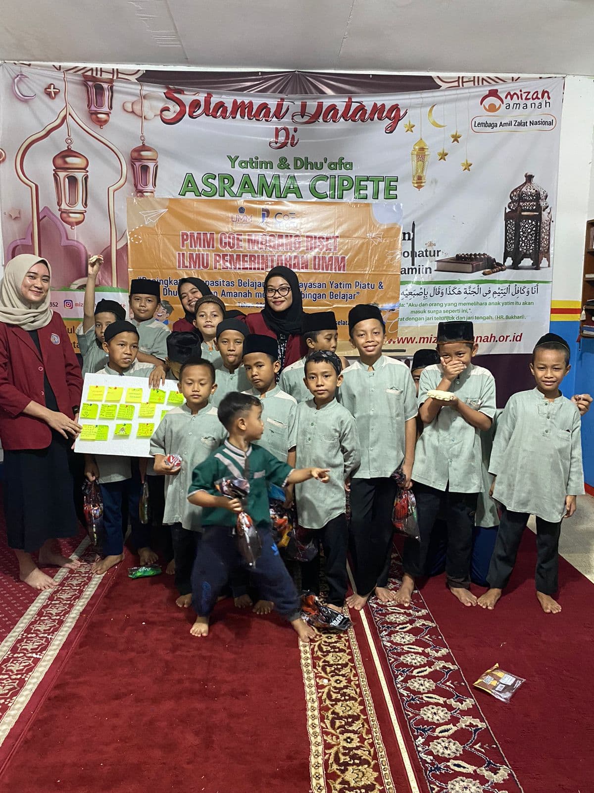 Jakarta- Mahasiswa UMM dalam rangka kegiatan pengabdian masyarakat oleh mahasiswa “center of excellent” (PMM COE) melakukan kegiatan PMM di Panti Asuhan Yatim & Dhuafa Mizan Amanah Cipete. Beranggotakan 5 orang mahasiswa ilmu pemerintahan yaitu Andi Muayyad Firkah, Alzena Firyal Yusandi, Muhammad Ryan Ezra, Olly Caesarya Reghina, dan Nurmayanda.