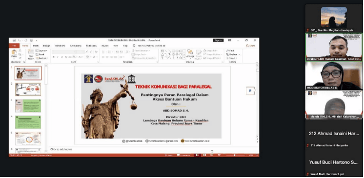 Dalam kegiatan ini Lembaga Bantuan Hukum (LBH) Rumah Keadilan melakukan pembinaan pelatihan paralegal serentak se Jawa Timur, Kantor Wilayah Kementerian Hukum Jawa Timur bermaksud untuk memfasilitasi dan mengkoordinasikan Pelatihan Paralegal secara daring (Online) bagi Kelompok Keluarga Sadar Hukum (Kadarkum) yang nantinya akan ditempatkan sebagai paralegal pada Pos Bantuan Hukum (Posbakum) di wilayahnya masing-masing.